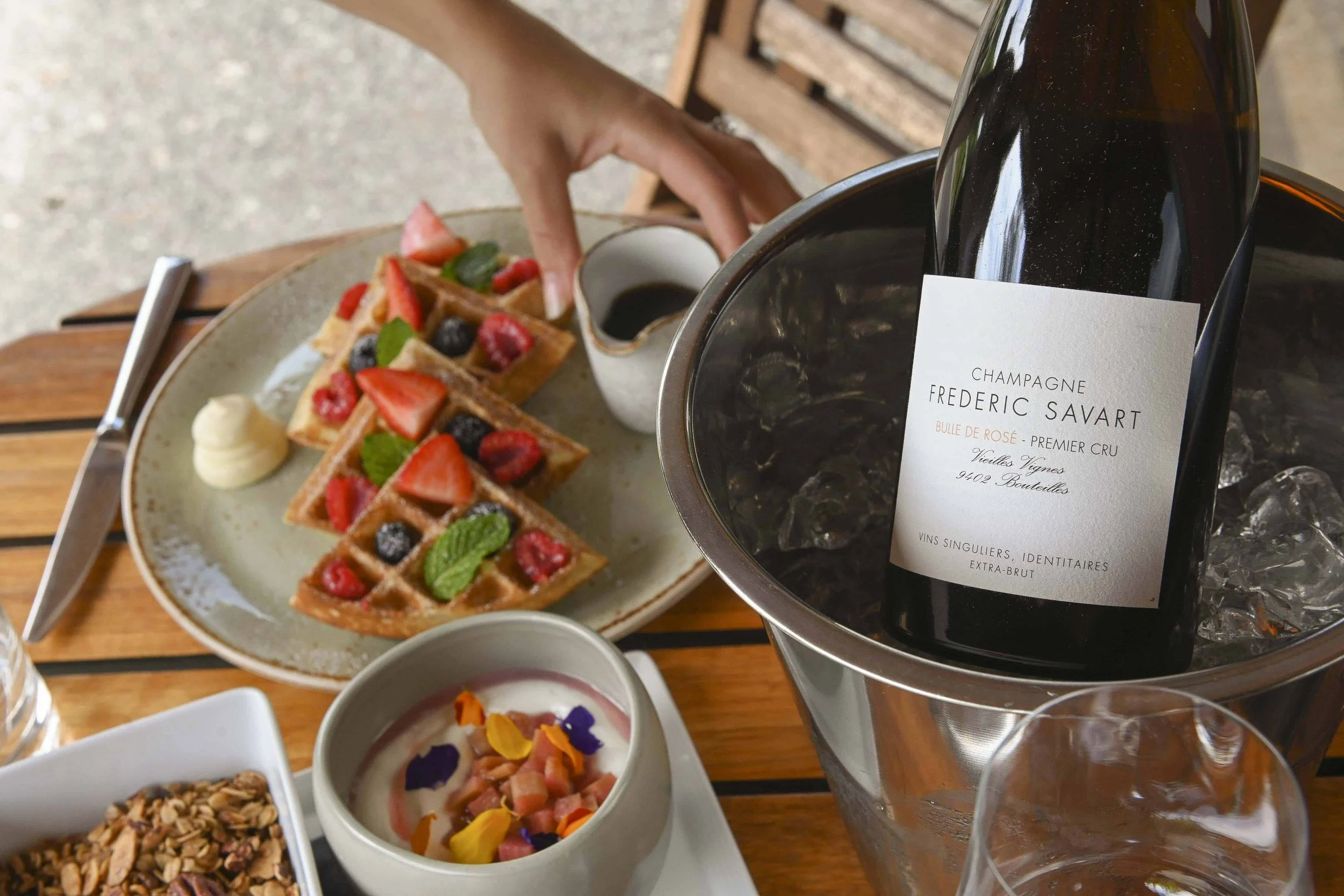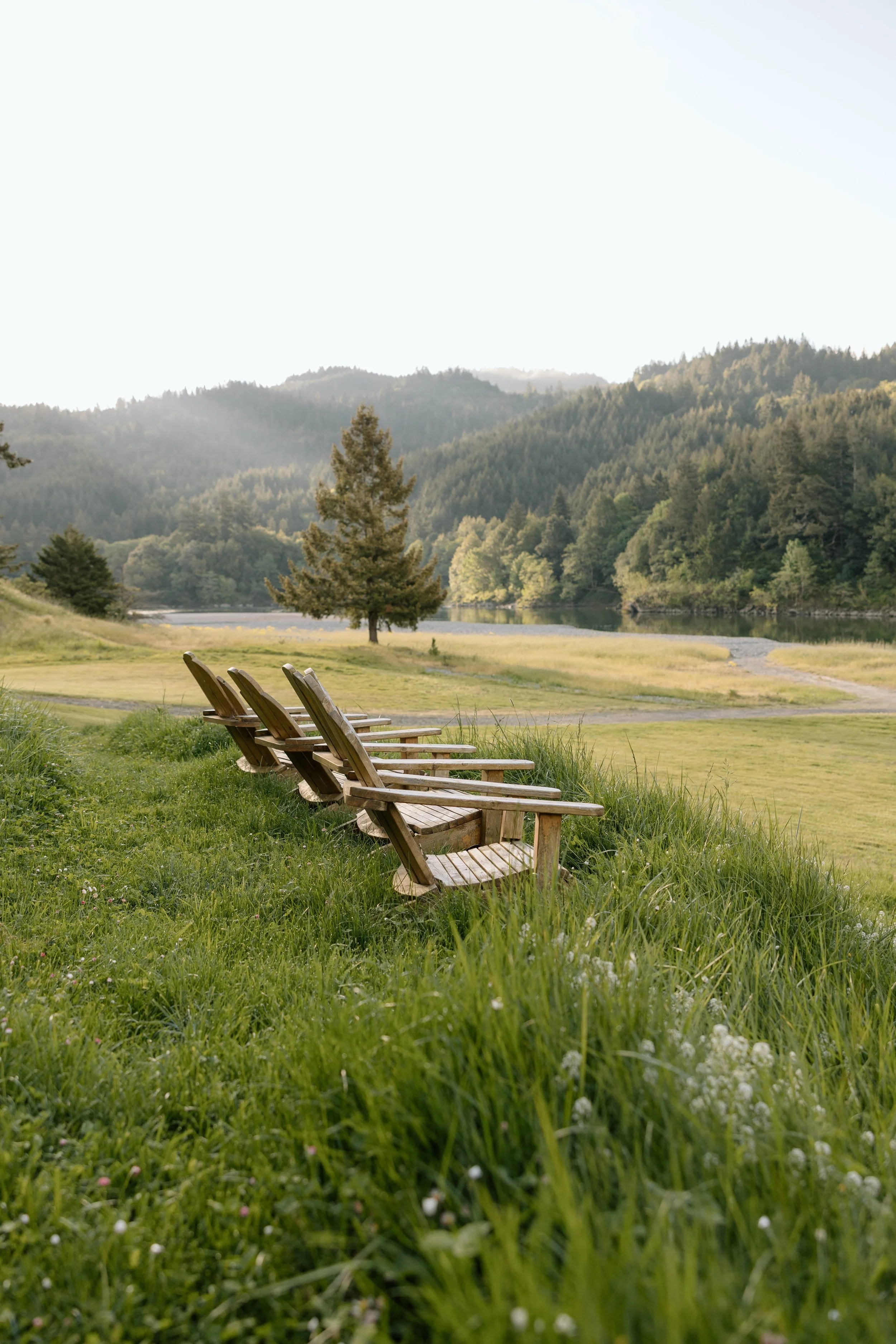 Saturday stretches wide, but never asks too much. Breakfast comes slowly—fruit, pastries, eggs, herbs, strong coffee—before the day opens into choice. Sauna and cold plunge, a paddle on the river, or simply time to yourself. By afternoon, it softens into picnic and shade: blankets on the grass, chilled bottles, the easy drift between water and cabin. As the light turns, wine appears by the river—unstructured, generous, just right. Dinner follows with a quieter precision—fire-kissed coastal flavors, clean and bright. Dessert lingers outside, if the night calls.